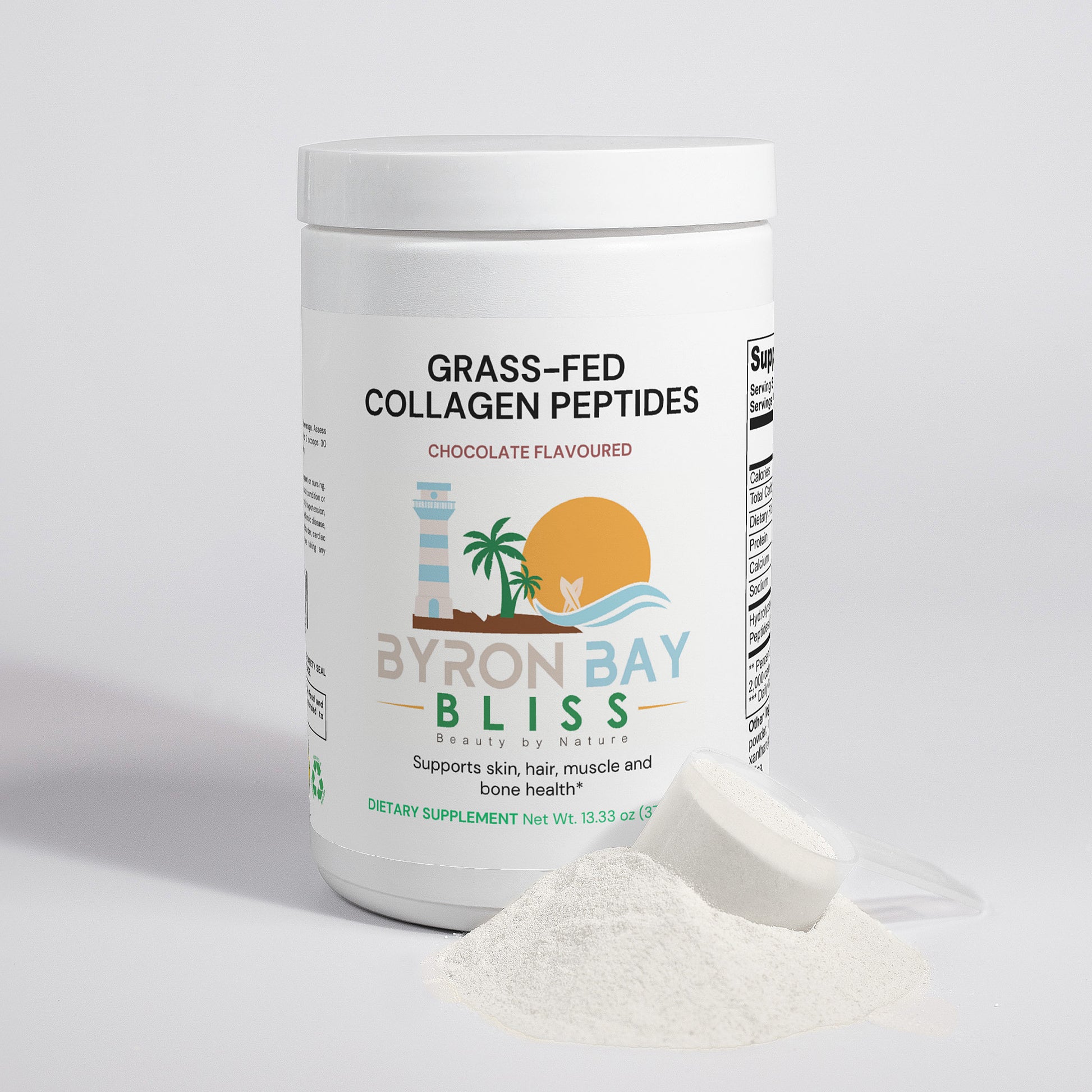 Ingredients: Hydrolyzed collagen peptides (from bovine hide), medium chain triglycerides, acacia powder, calcium carbonate, pea protein powder, natural flavor, silica, stevia extract powder.