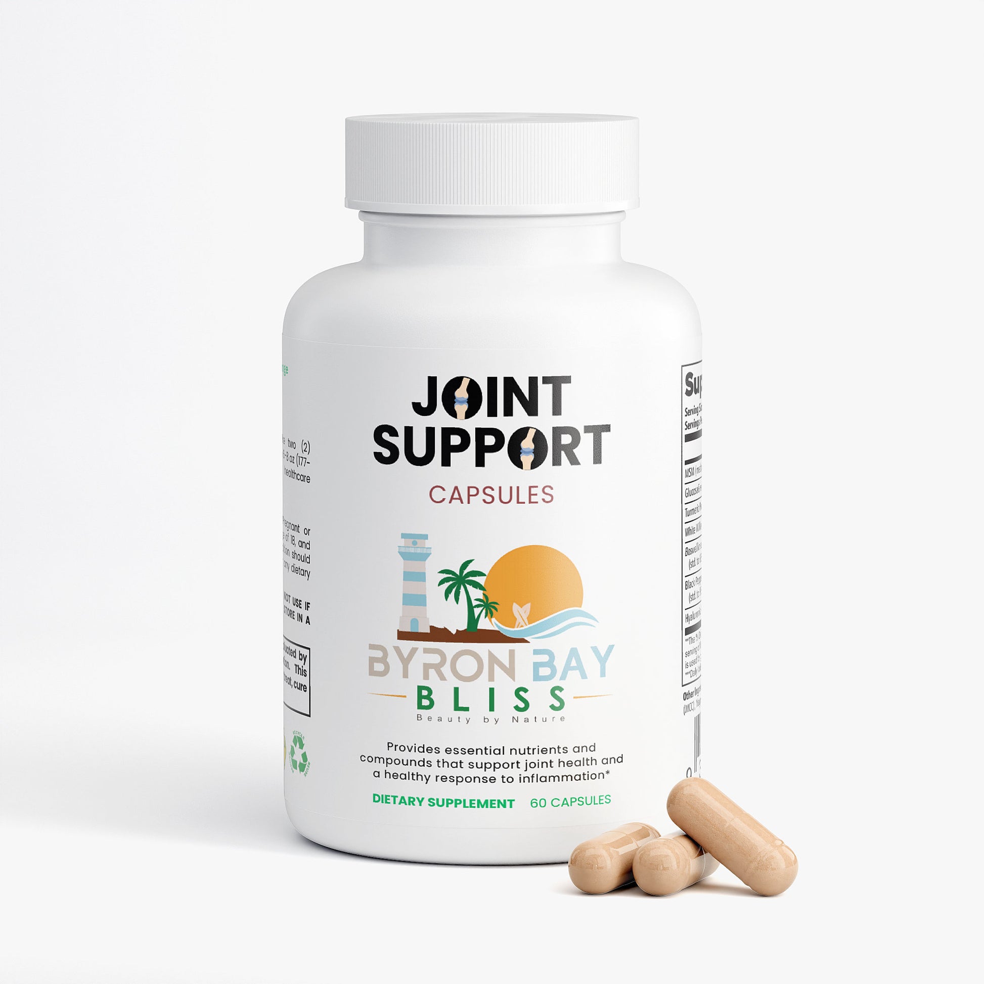 Ingredients: MSM (methylsulfonylmethane), GlucosaGreen® vegetal glucosamine HCl, Turmeric Powder (root), White Willow Bark Extract, Boswellia serrata Extract (resin)(std. to 65% boswellic acids), Black Pepper Extract (fruit) (std. to 95% piperine), Hyaluronic Acid, Gelatin (capsule), Microcrystalline Cellulose (MCC), Magnesium Stearate, Olive Oil, Silicon Dioxide.
