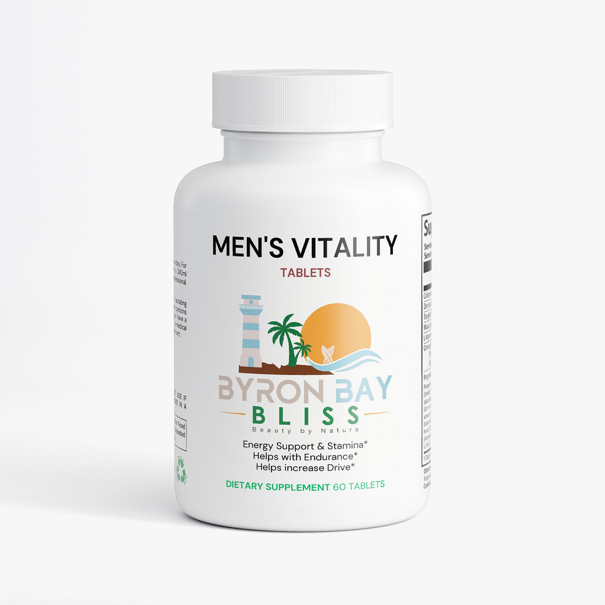 Ingredients: Calcium (as Calcium Carbonate), Zinc (as Zinc Oxide), Tongkat Ali root, Maca root, L-Arginine HCL, Ginseng Eleutherococcus Blend (Panax Ginseng, Eleutherococcus Senticosus), Proprietary Blend (Pumpkin Extract, Sarsaparilla Extract, Muira Puama Extract, Oat Straw, Boron, Cayenne Pepper, Catuaba, Licorice Extract, Tribulus Terrestris, Orchic, Oyster Extract, Astragalus Extract, Nettle Extract), Vegetable Stearic Acid, Vegetable Magnesium Stearate, Silicon Dioxide.